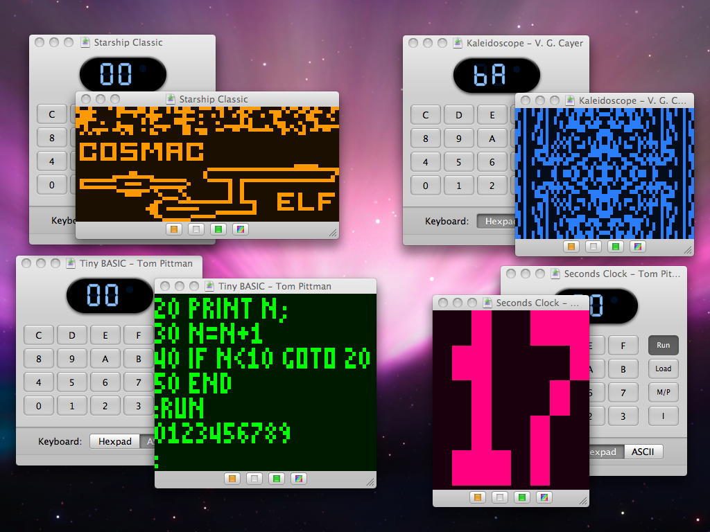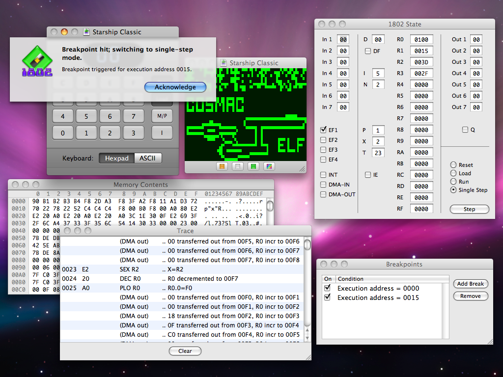 You can learn a lot about modern computers by studying one from the days of disco! TinyELF for Mac OS X brings emulation of 1802-based microcomputers to the Macintosh platform, and runs on OS X 10.4 (Tiger) or greater. TinyELF features pixie graphics, single-step debugging, a CPU state viewer, program execution trace, breakpoints and more. Its help book includes a full tutorial on computer fundamentals and programming.